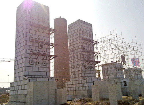 由我公司承建的福建经纬新纤科技实业有限公司3台20t/h循环流化床锅炉烟气除尘脱硫设备、4台1400万大卡导热油炉烟气除尘脱硫设备目前进展顺利。自开工以来,项目部和工人通力协作、共同努力,合理安排各施工工序,现已基本完成四台花岗岩脱硫塔的砌筑。