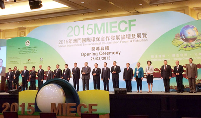 3月26至28日,2015 年澳门国际环保合作发展论坛及展览(MIECF)在澳门特别行政区威尼斯人度假村酒店举行。本次活动以“绿色经济—清新空气—绽放商机”为主题,共有50多名来自中国、英国、法国等国家和地区的环保专家出席论坛,约有来自20多个国家和地区的450家参展商参加展览。澳门特别行政区长官崔世安、澳门中联办副主任姚坚、外交部驻澳门公署副特派员潘云东、国家科技部副部长张来武等嘉宾以及来自海内外的环保专家、业界人士逾千人出席了开幕式。
